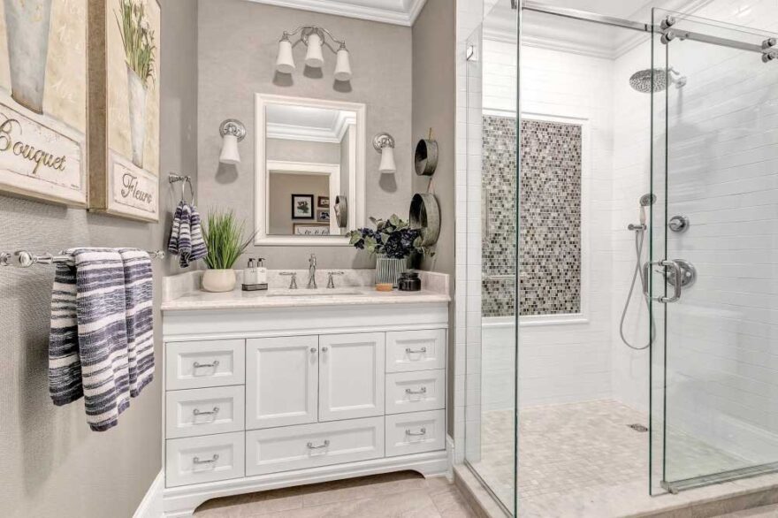 white bathroom vanity with silver hardware, walk in shower with silver shower fixtures