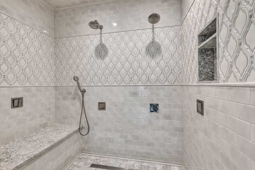 grey shower tile with silver shower fixtures